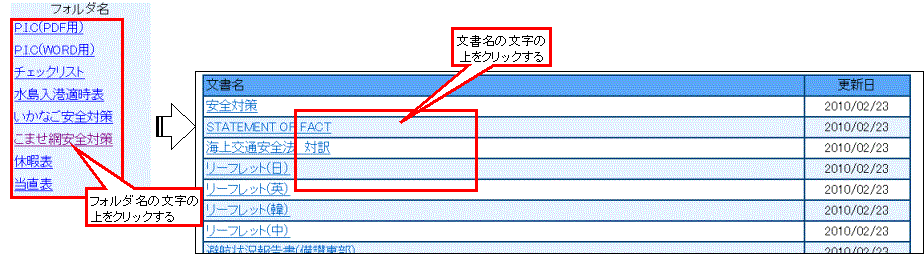 1.情報ライブラリ画面左側のフォルダ名欄から、取り出したい文書のフォルダを選んで、文字の上をクリックします。 |