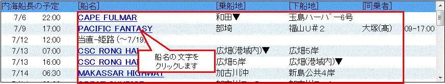 1.嚮導予定の船名をクリックすると、水先人支援情報の画面を表示します。 |