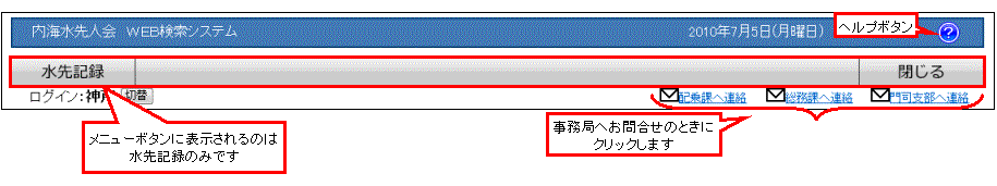 「ログインに戻る」ボタンを押すと、ログイン画面が表示されて、再び最初から水先人WEB検索システムを使うことができます。 |