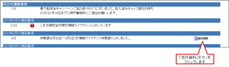 2.「添付資料」ボタンをクリックすると、該当する連絡事項の添付資料の画面が表示されます。 |