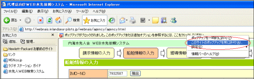 2.IMO-NOを入れて[抽出]を押したら「ポップアップがブロックされました」というメッセージが表示される。 |