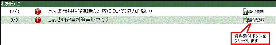 2.「添付資料」ボタンをクリックすると、該当するお知らせの添付資料の画面が表示されます。 |