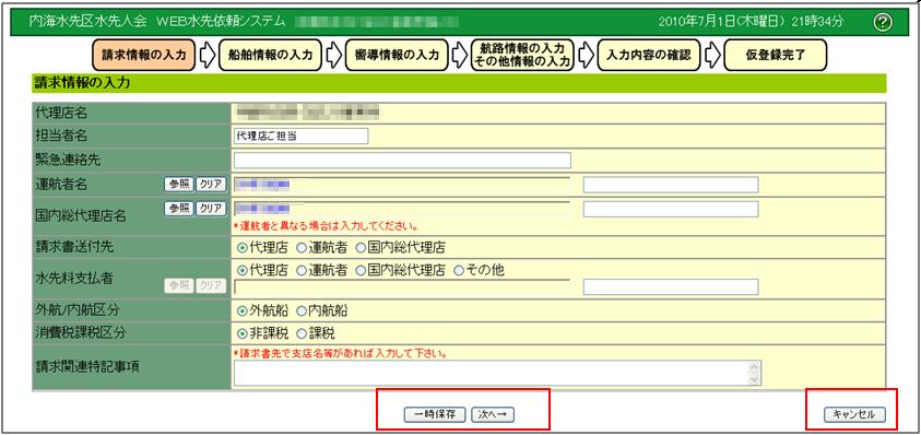 請求情報・船舶情報・嚮導情報・航路通報/その他情報の各入力画面を順に入力していきます。 |
