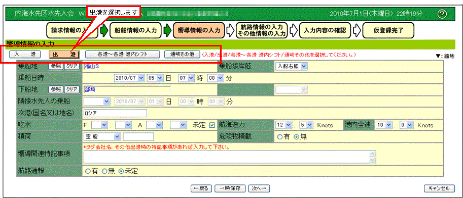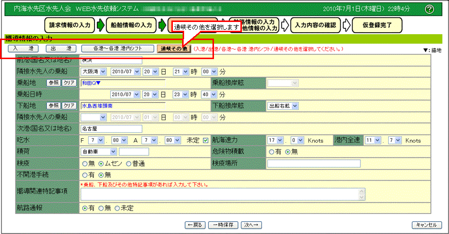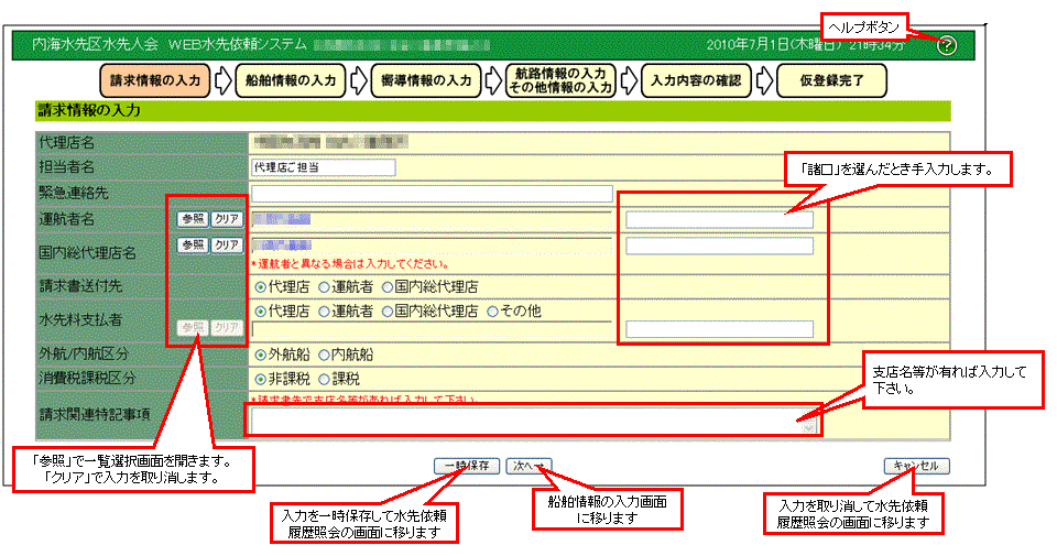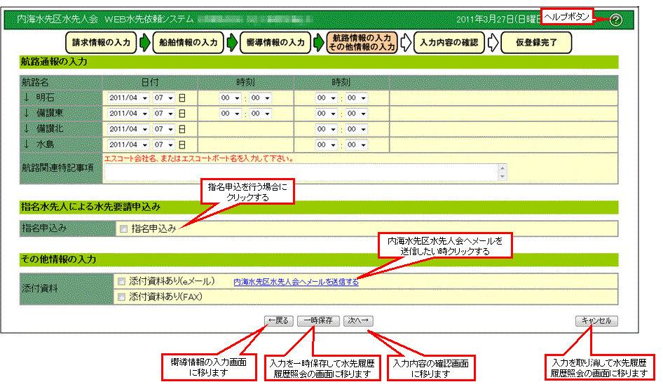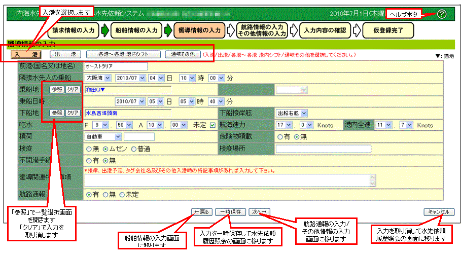 水先依頼情報の入力を行います。 |