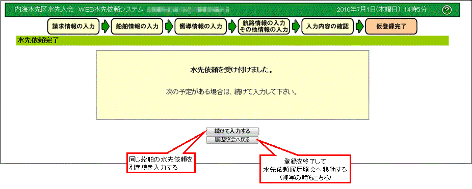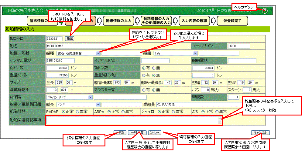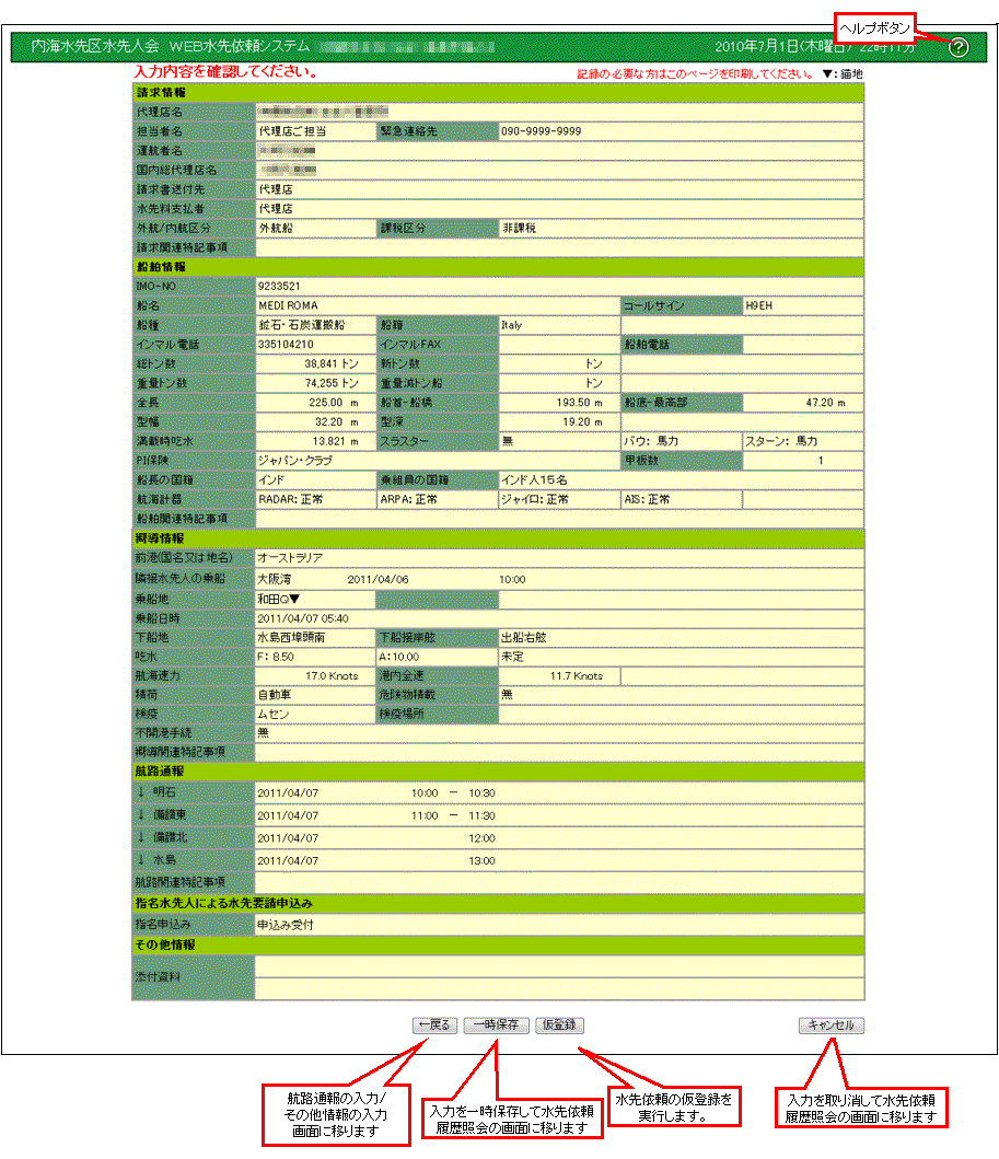 入力に間違いがなければ、「仮登録」のボタンを押して下さい。水先依頼が当会に申請されます。 |