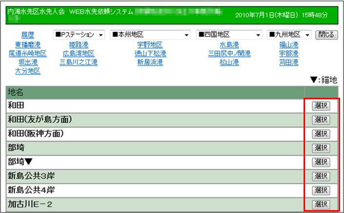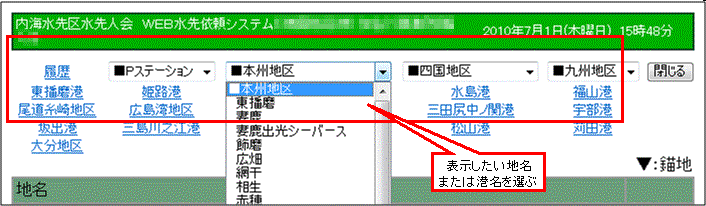 2.地区のプルダウンメニューか、港名または「履歴」を選択します。 |